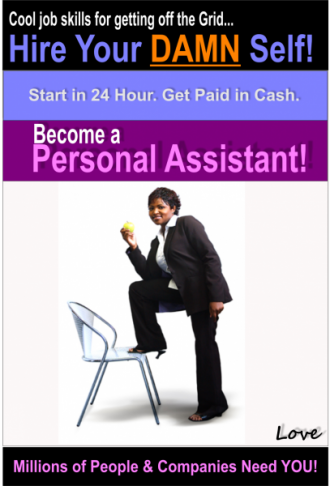 This eBook, Become a Personal Assistant will show you how to start working within 24 hours, it won't cost you a dime to find a job, and you can work worldwide. You can also barter your job skills for a free place to live, food and sometimes a car.